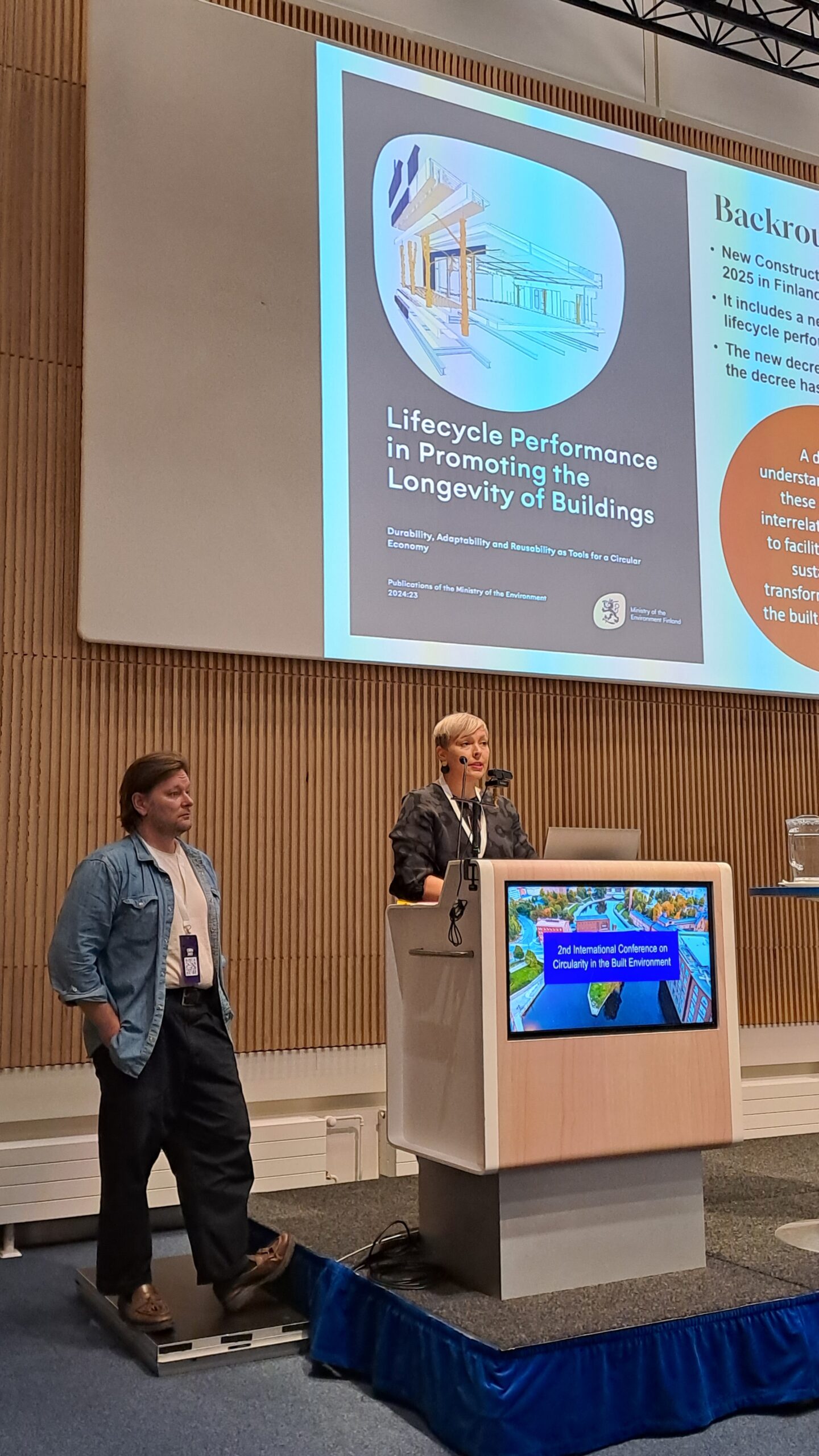 CiBEn-konferenssissa Rakennustietosäätiö RTS:n Sini Saarimaa ja Tampereen yliopiston Tuomo Joensuu esittelivät EKAT-hankkeeseen liittyvän tutkimuksen Integrating Circular Economy Principles in Building Design. Tutkimuksessa käsiteltiin säilyvyyden, joustavuuden ja uudelleenkäytettävyyden, eli elinkaariominaisuuksien yhteensovittamista rakennussuunnittelussa. Elinkaariominaisuudet mahdollistavat rakennuksen pitkäaikaisen käytön muuttuvissa olosuhteissa sekä rakennukseen sidottujen resurssien hyödyntämisen rakennuksen purkamisen jälkeen.